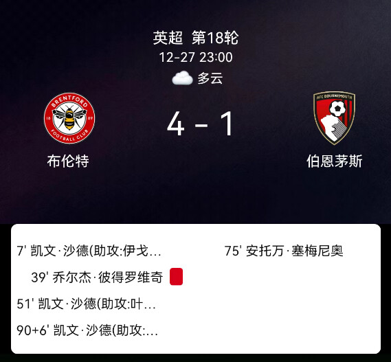 北京时间12月27日23:00,2025-2026赛季英格兰足球超级联赛第18轮,布伦特福德主场对阵伯恩茅斯。第7分钟沙德破门,1-0;第39分钟彼得罗维奇乌龙,2-0;第51分钟沙德双响,3-0;第75分钟塞门约扳回一分,3-1;第90+6分钟沙德戴帽,4-1;双方无红黄牌。最终比分,布伦特福德4-1伯恩茅斯。