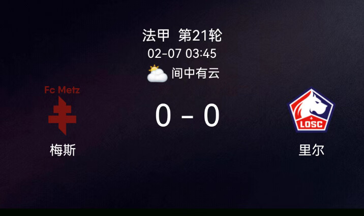 北京时间2月7日法甲第21轮,梅斯对阵里尔。全场无进球、无红黄牌,双方均未攻破对手球门。最终比分,梅斯0-0里尔。