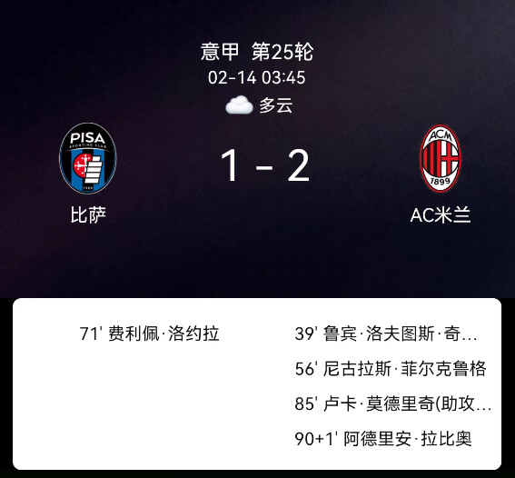 北京时间2月14日意甲第25轮,比萨对阵AC米兰。第40分钟洛夫图斯-奇克破门1-0;第71分钟洛约拉破门1-1;第85分钟莫德里奇破门2-1;第90+1分钟拉比奥两黄变一红被罚下。最终比分,比萨1-2AC米兰。