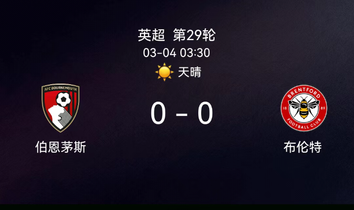 北京时间3月4日英超第29轮,伯恩茅斯对阵布伦特福德。全场无进球,双方无红黄牌。最终比分,伯恩茅斯0-0布伦特福德。