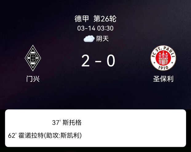 北京时间3月14日05:26,德国足球甲级联赛第26轮继续进行,门兴格拉德巴赫主场迎战圣保利。上半场双方展开激烈对抗,攻防转换十分频繁,门兴在主场占据一定的控球优势,不断通过边路与中路配合冲击对手防线。第37分钟,凯文-施特格尔抓住机会完成破门,帮助门兴打破僵局,带着1-0的优势进入中场休息。下半场圣保利试图反扑,但始终未能找到有效破门办法。第62分钟,约瑟夫-斯卡利送出助攻,奥诺拉打入一球锁定胜局。最终全场比赛结束,门兴格拉德巴赫主场2-0击败圣保利。